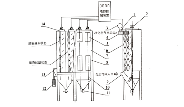 含塵氣體由進(jìn)氣管進(jìn)入灰斗,再向上經(jīng)由箱體內(nèi)的濾袋凈化后,由電動(dòng)三通閥開(kāi)啟的主閥板處排至出氣管,出氣管的氣體再經(jīng)離心風(fēng)機(jī),煙囪排入大氣中。