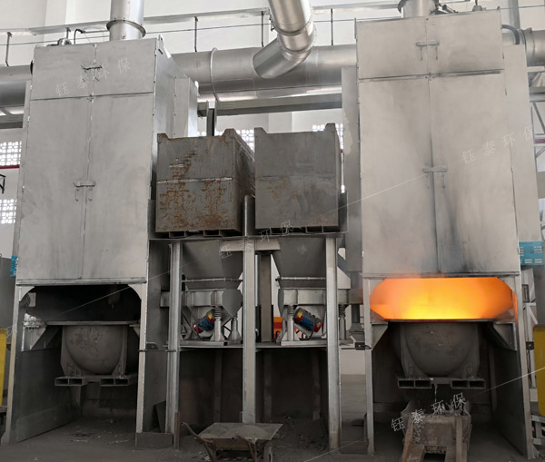 將熔煉爐中鋁灰扒出,盛入鋁灰機專用的鍋中,通過設備攪拌,將比重不同的金屬鋁和熱殘灰分離。在對高溫鋁灰進行攪拌的這個過程是粉塵最為嚴重的時候,此時炒灰機配套的55KW除塵器需要滿負